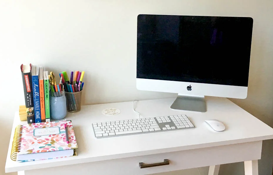 Creating a super cute + functional workspace was at the top of my list when starting my business. We spend 8+ hours a day, 5-6 days a week sitting at our desks, so we need to enjoy the space. I live in a one-bedroom apartment, so my “office” is a section of my living room. Luckily, I have floor-to-ceiling windows which makes the space feel larger.