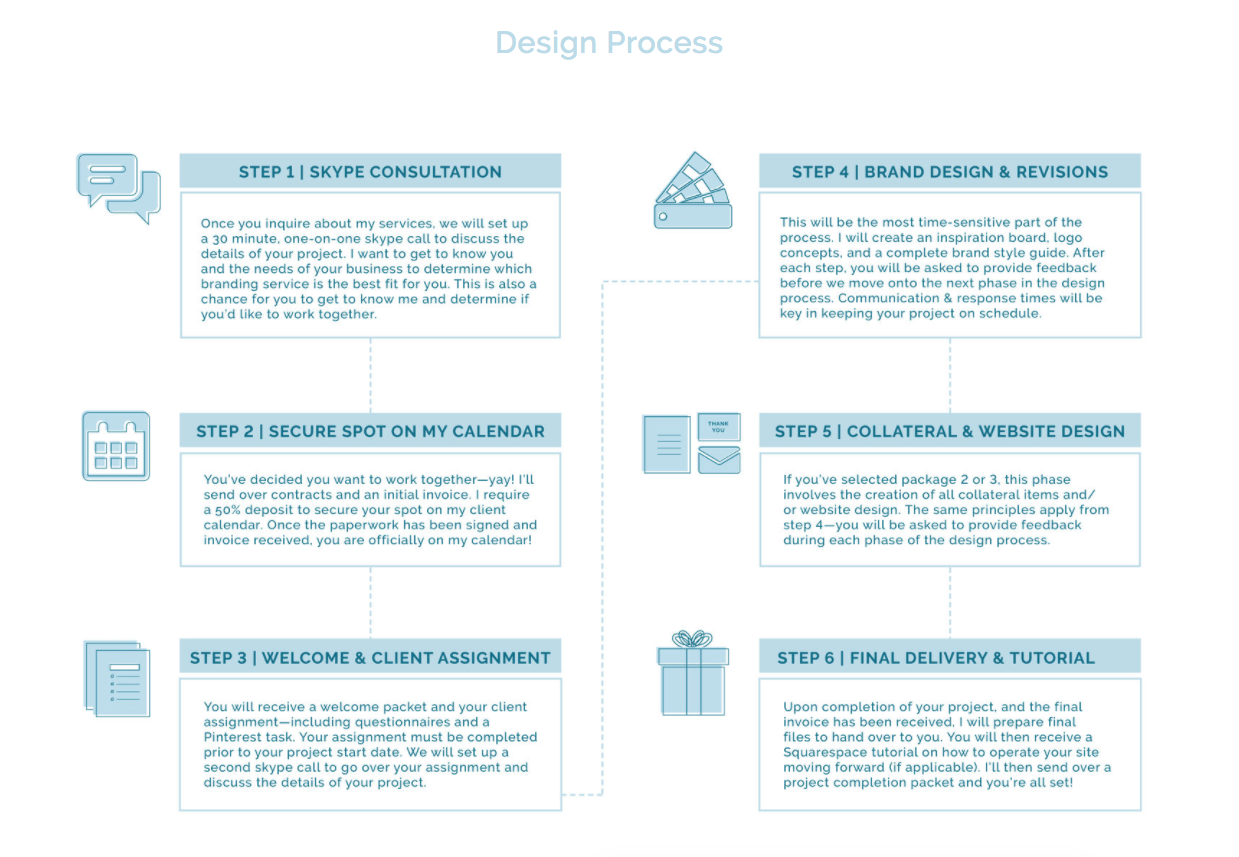 In the course, Lauren had us map out our entire client process from start to finish. Including time for research, sending emails, and client meetings. Then we went back through the process and created every shortcut we could think of. We created email templates for every step, planned out when we would send client gifts, and setup design templates to make our process as smooth and seamless as possible.