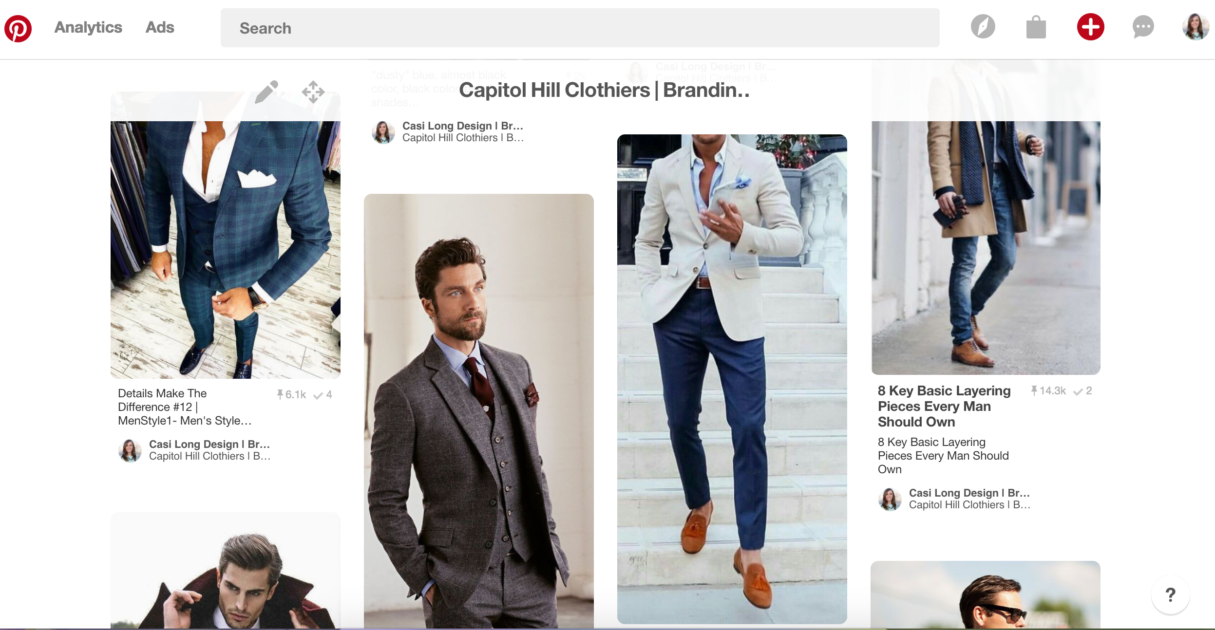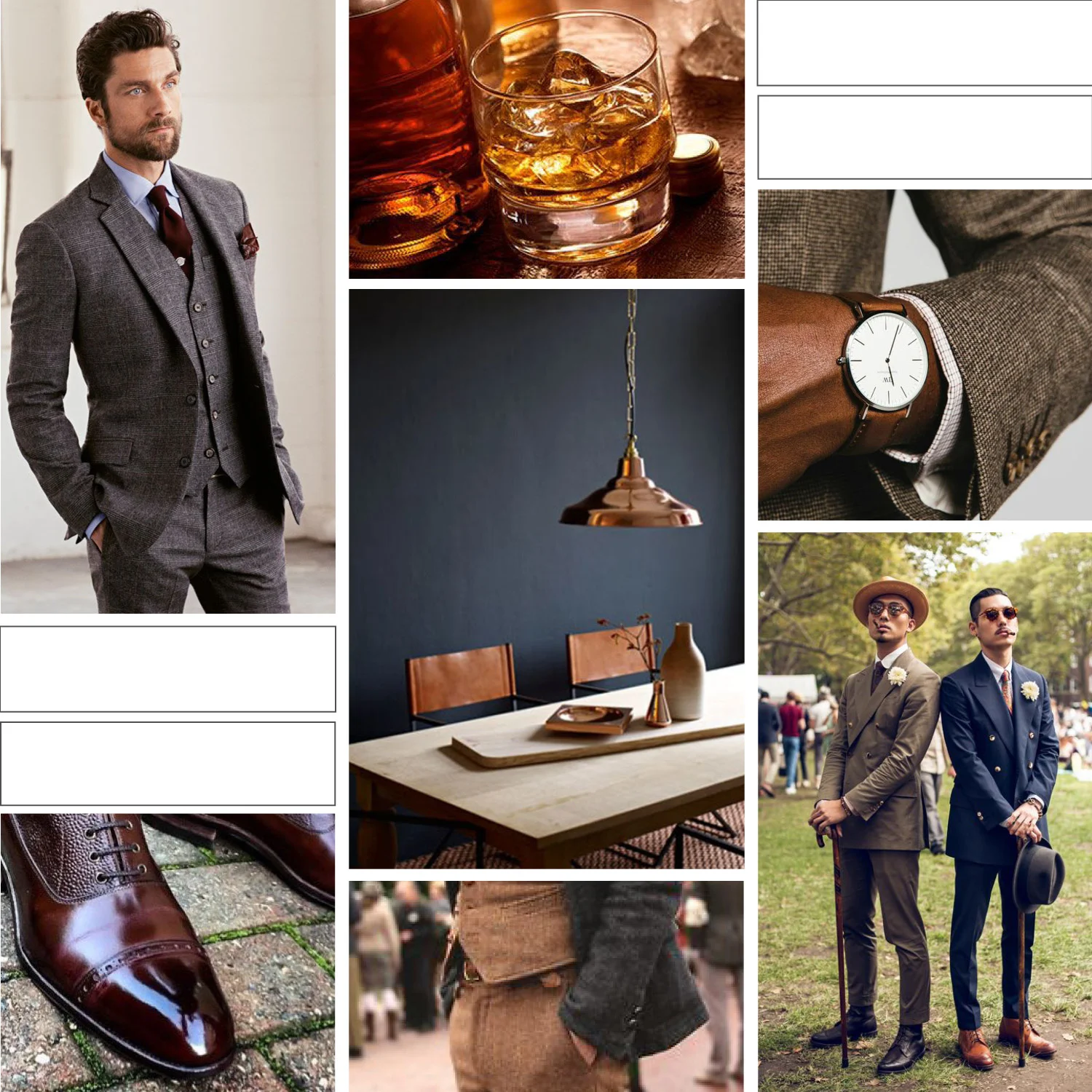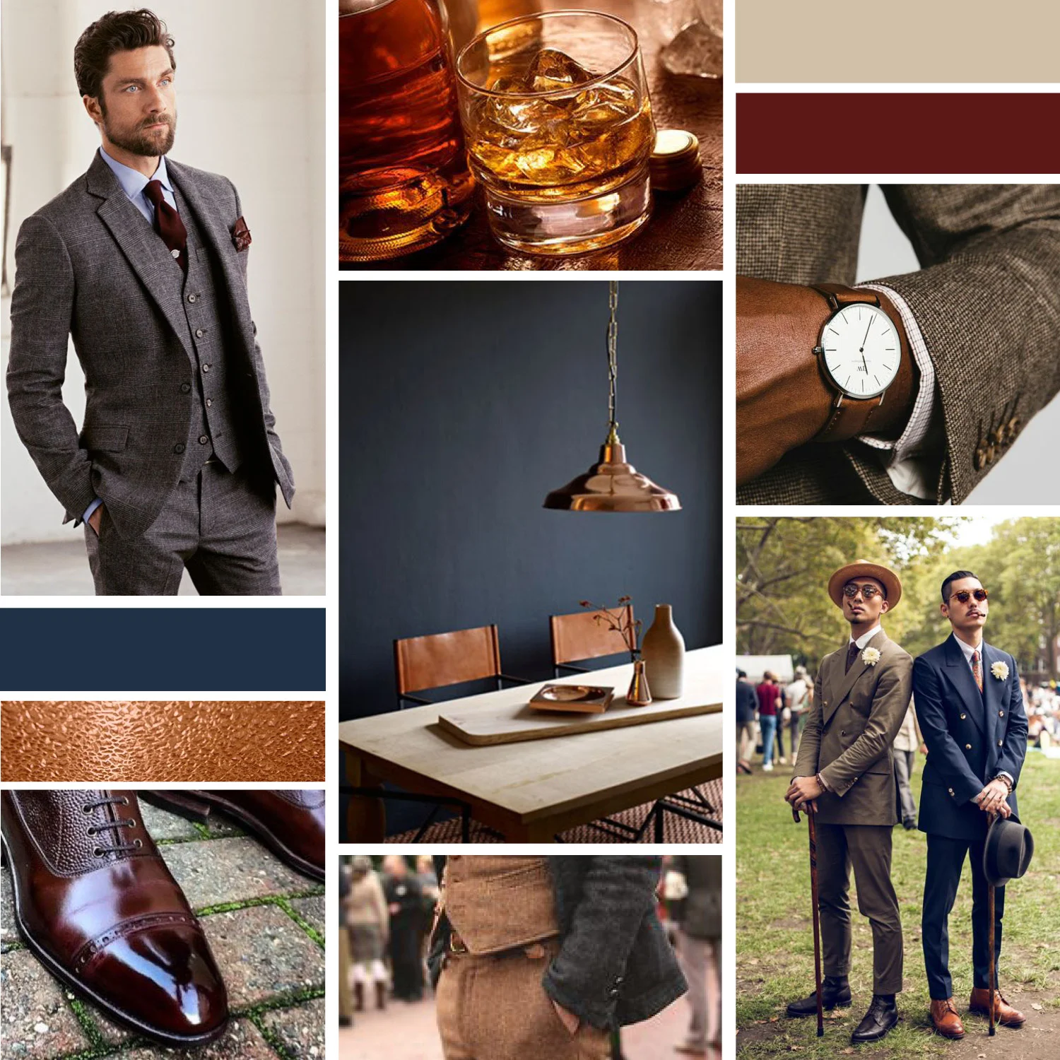 For this clothing company’s brand, I pulled colors from the suit combinations: navy, burgundy, and khaki. I also pulled from the navy and copper home interior photo. You may also get a classic, sleek vibe from these images and colors. This was crucial as I created a brand that represented the core of my client’s business.