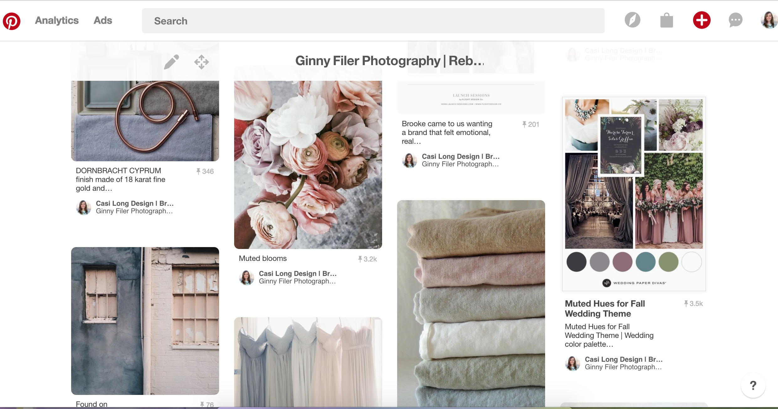 The easiest ways to gather inspiration for a color palette is to create a Pinterest board. Use the board to gather 20-30 images you like. I typically try to find a variation of image styles: home decor, lifestyle images, clothing/outfits, textures/colors, and design inspiration (like fonts or logo designs).